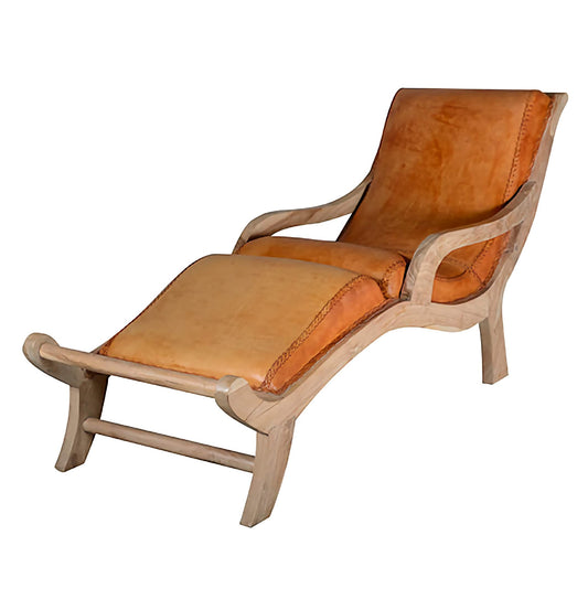 CHAISE LONG IN LEGNO DI TEAK SBIANCATO E CUOIO ARANCIO