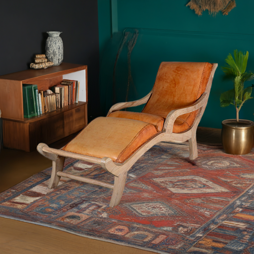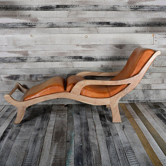 CHAISE LONG IN LEGNO DI TEAK SBIANCATO E CUOIO ARANCIO