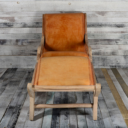 Questa chaise longue è realizzata in teak sbiancato e cuoio arancio di alta qualità. Con il suo design elegante e resistente, è l'aggiunta perfetta per un arredamento moderno e di classe. Rilassati con stile su questa comoda chaise longue, perfetta per godersi il sole o leggere un libro.