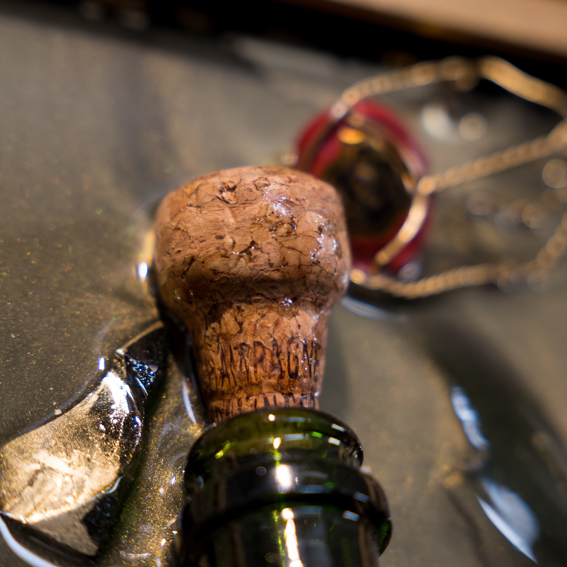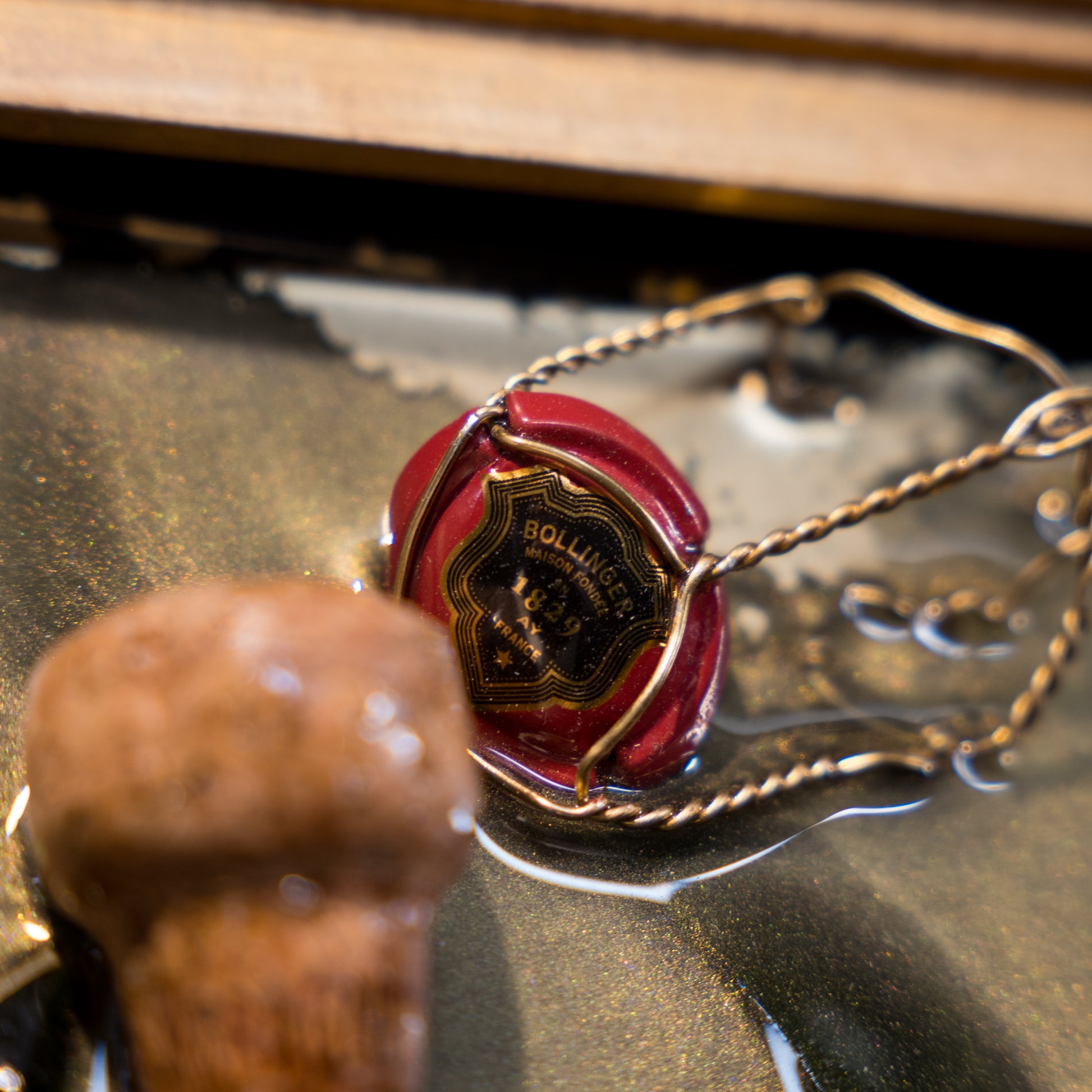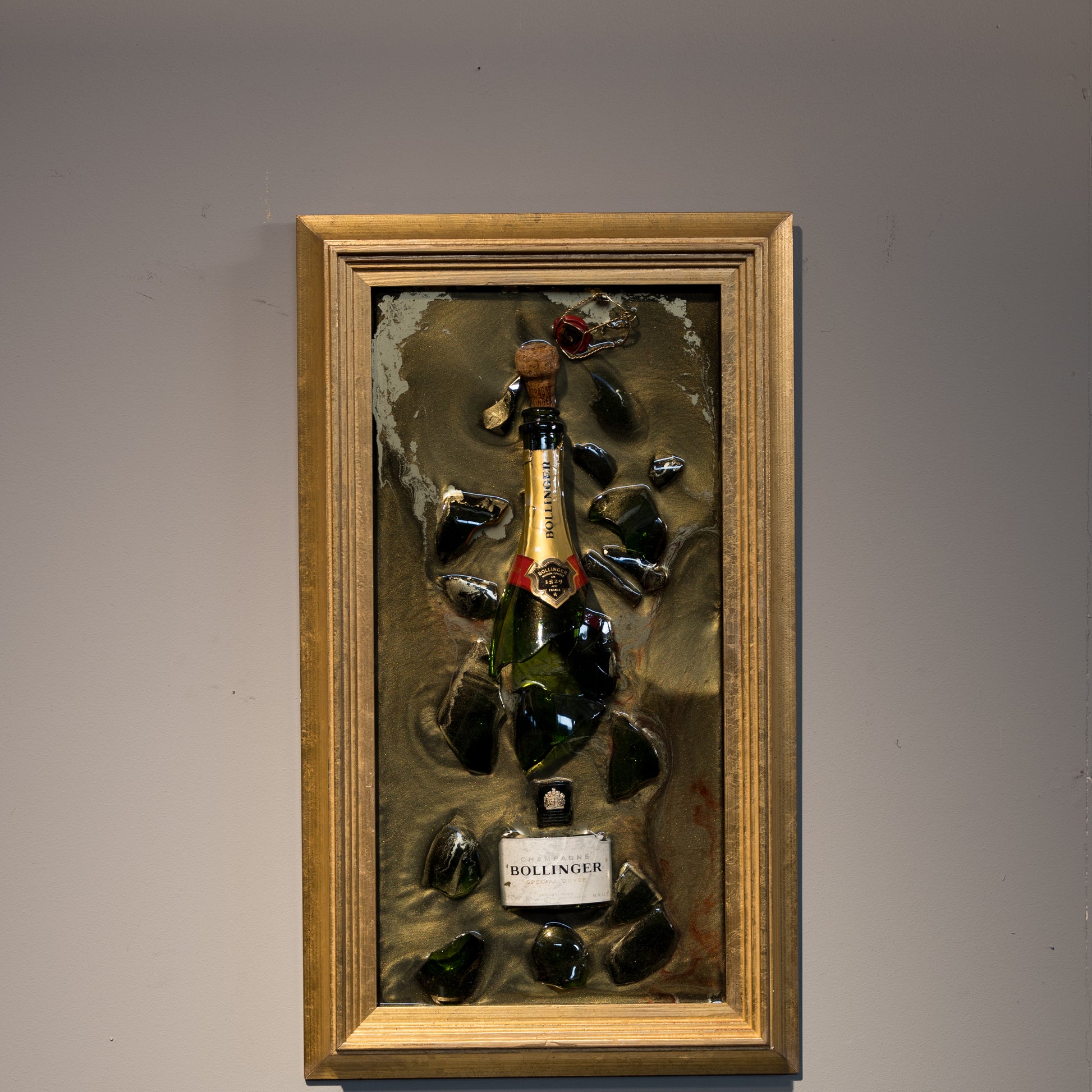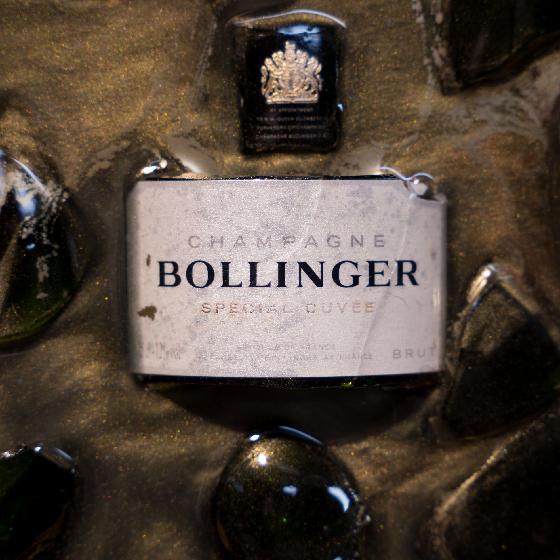 I frammenti di Champagne Bollinger, scelti con cura per la loro lucentezza e qualità, fluttuano sospesi nella resina trasparente che evoca l'effetto delle bollicine in un bicchiere di champagne, creando un'atmosfera di festa e raffinatezza. La cornice classica dorata a guazzo aggiunge un tocco di regalità e nobiltà, incorniciando splendidamente questa meraviglia sensoriale.