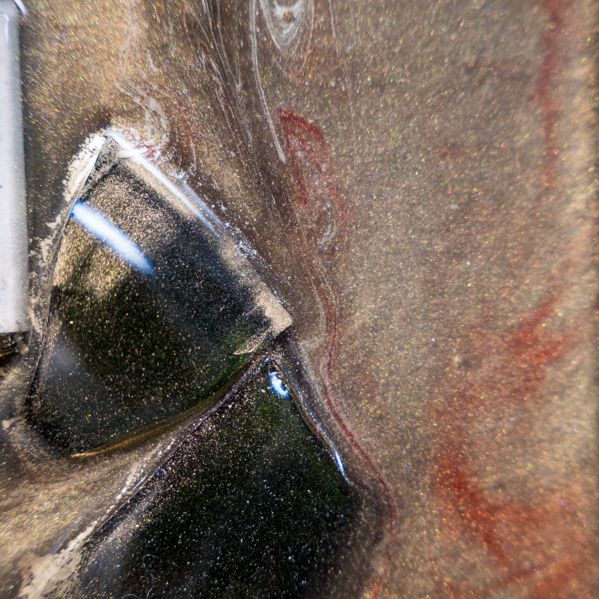 Ogni pezzo è un'opera d'arte unica, che fonde la maestosità della cornice classica dorata a guazzo con la prelibatezza dei frammenti di Champagne Bollinger e gli effetti di resina artistica colorata con pigmenti "magici" dell'artista, creando un'esperienza visiva indimenticabile che incanta gli occhi e delizia l'anima.