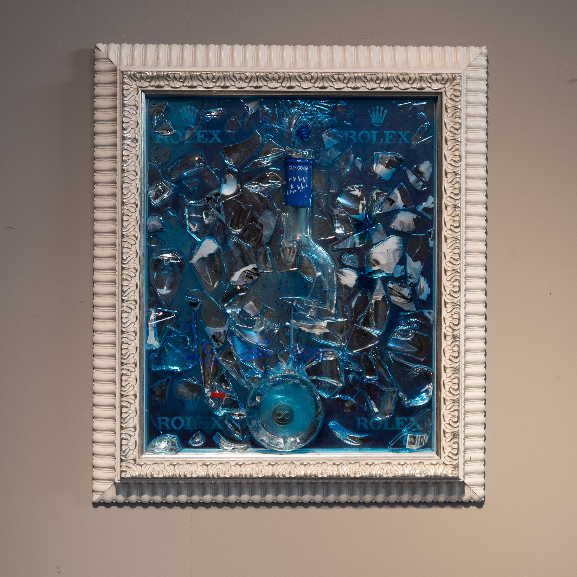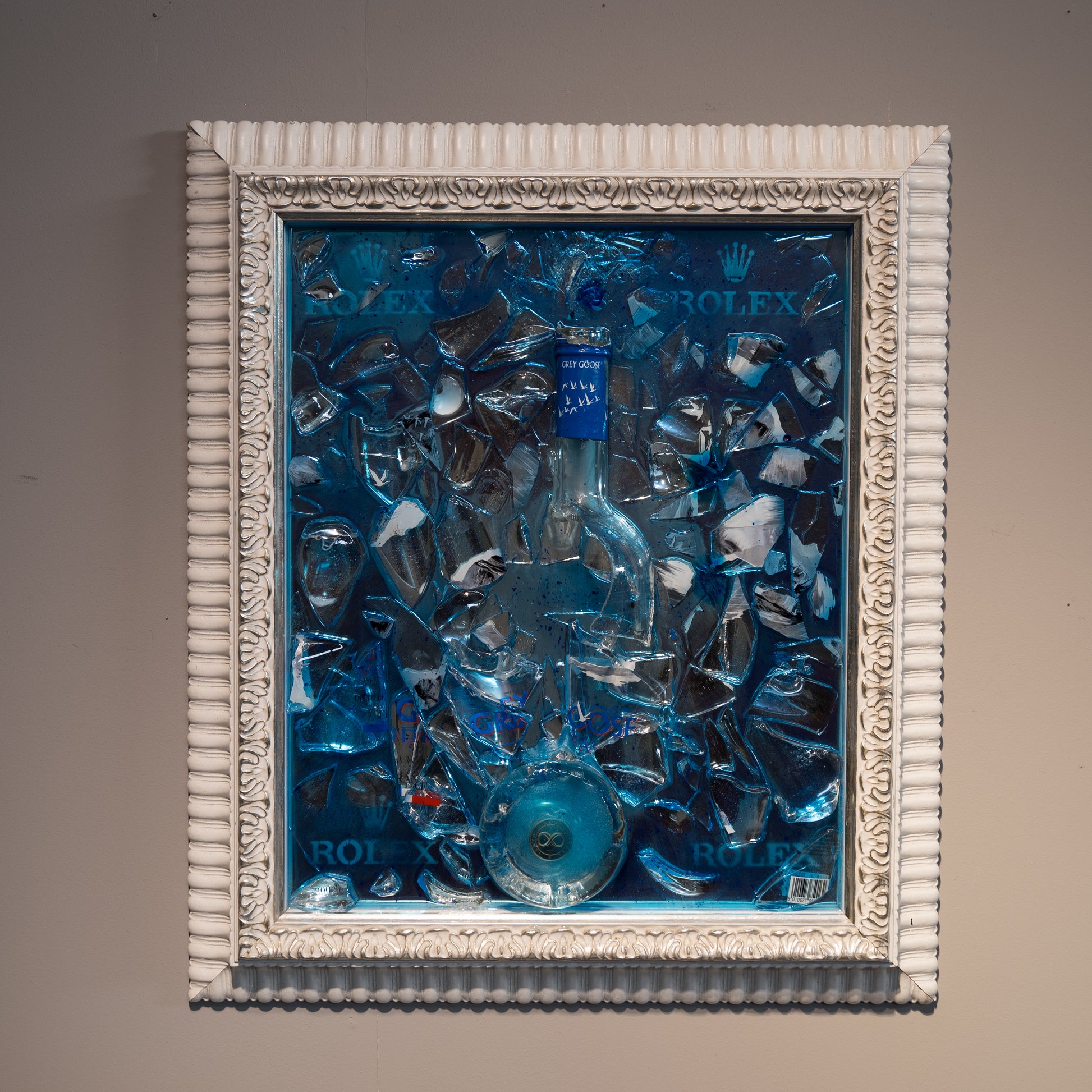 Titolo: Cornice Esclusiva con Frammenti di Grey Goose e Logo Rolex Colorato