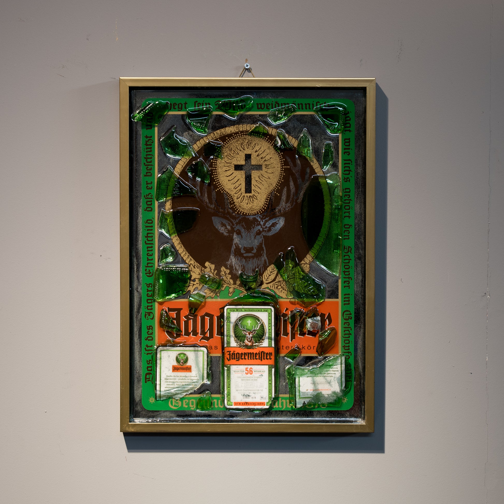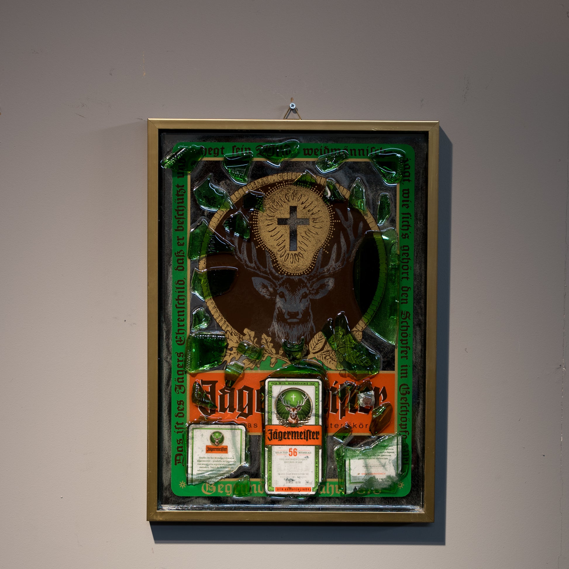 Titolo: Cornice Moderna con Vecchio Specchio Pubblicitario e Frammenti di Amaro Jägermeister