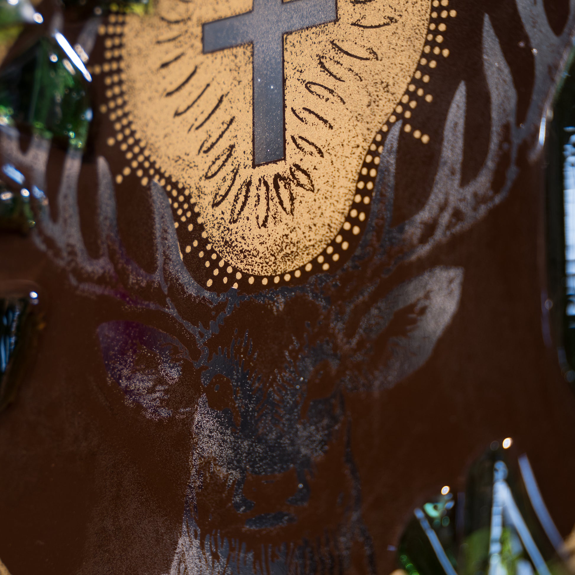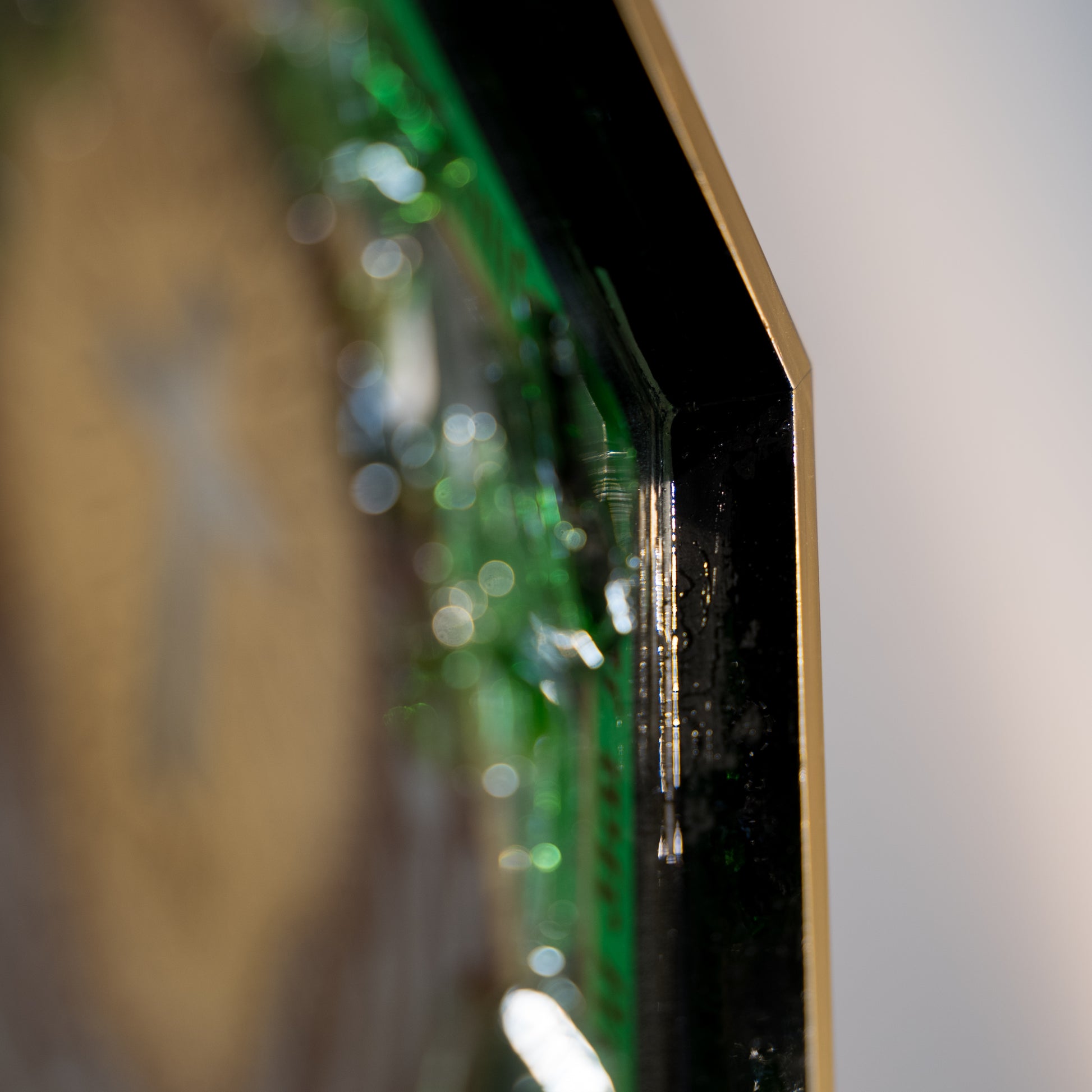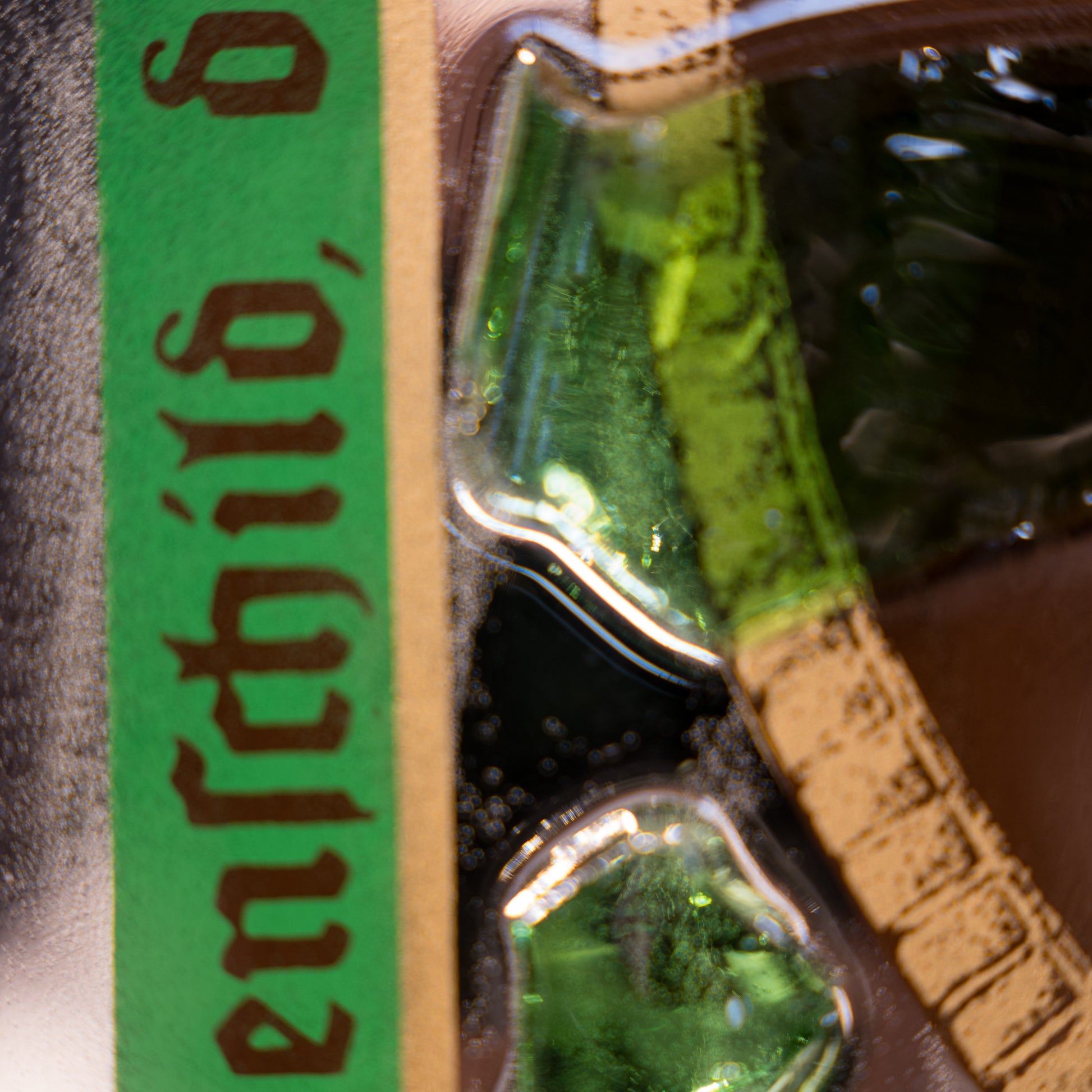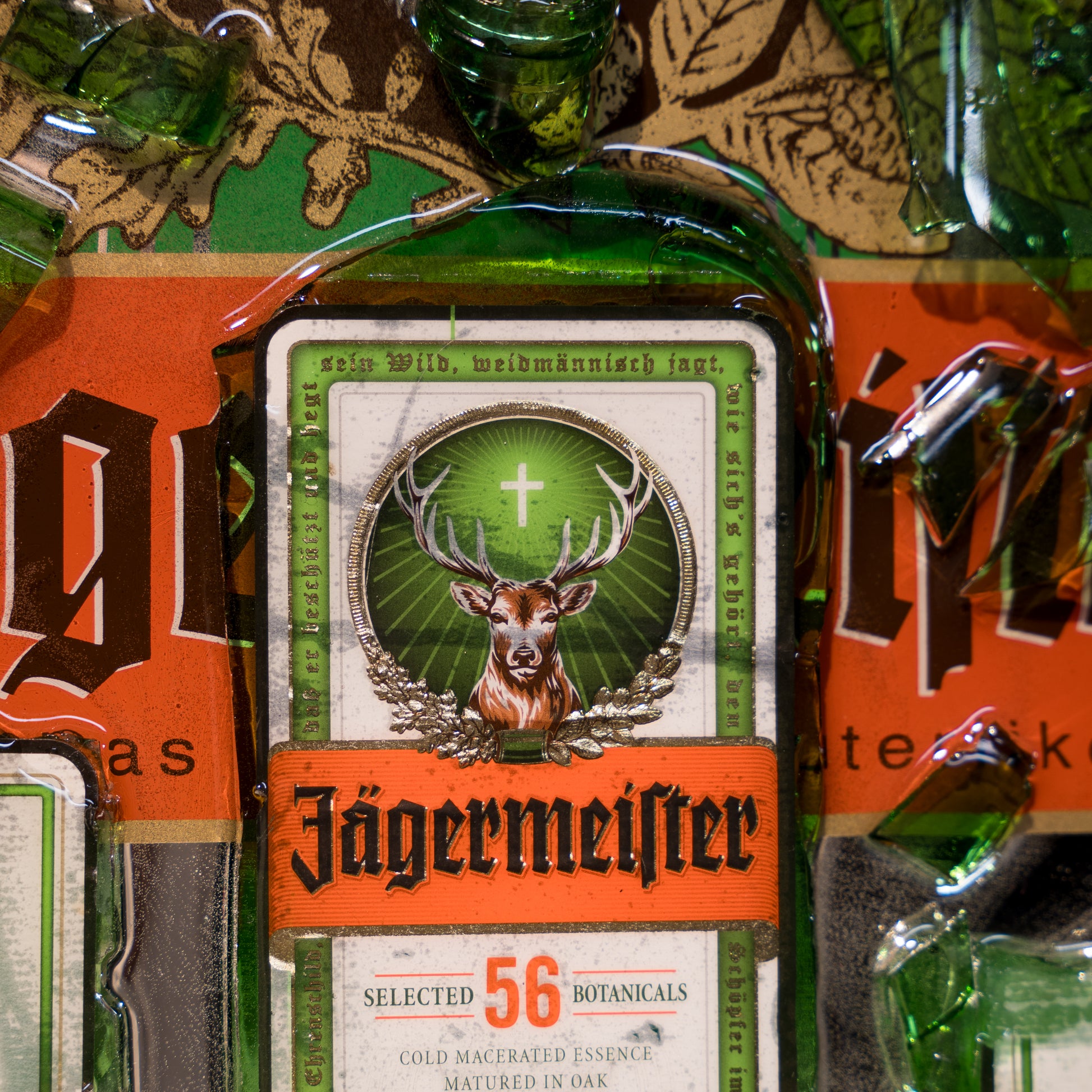 Al centro di questo straordinario quadro, troverai i frammenti autentici dell'amaro Jägermeister, selezionati per la loro profondità e complessità aromatica. La resina epossidica è stata sapientemente utilizzata per preservare e proteggere i frammenti, creando una superficie liscia e brillante che incanta lo sguardo.