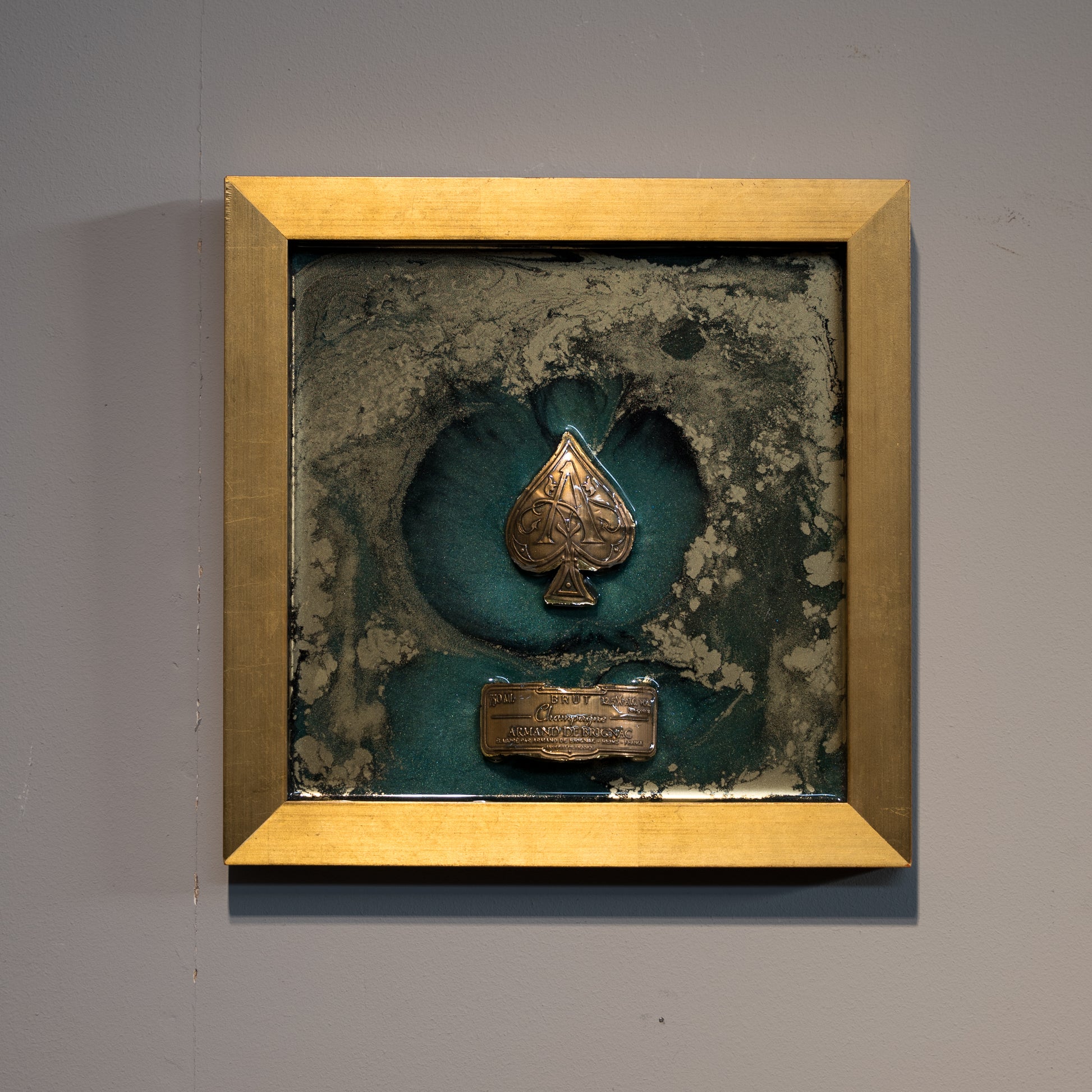 Immergiti in un'esperienza tropicale di lusso e raffinatezza con la nostra Cornice Moderna Lineare in Foglia Oro, arricchita da effetti caraibici creati con resina epossidica e pigmenti esclusivi, accanto ai frammenti scintillanti di Champagne Armand de Brignac. Questo straordinario pezzo d'arte incarna l'eleganza e la vivacità dei Caraibi.