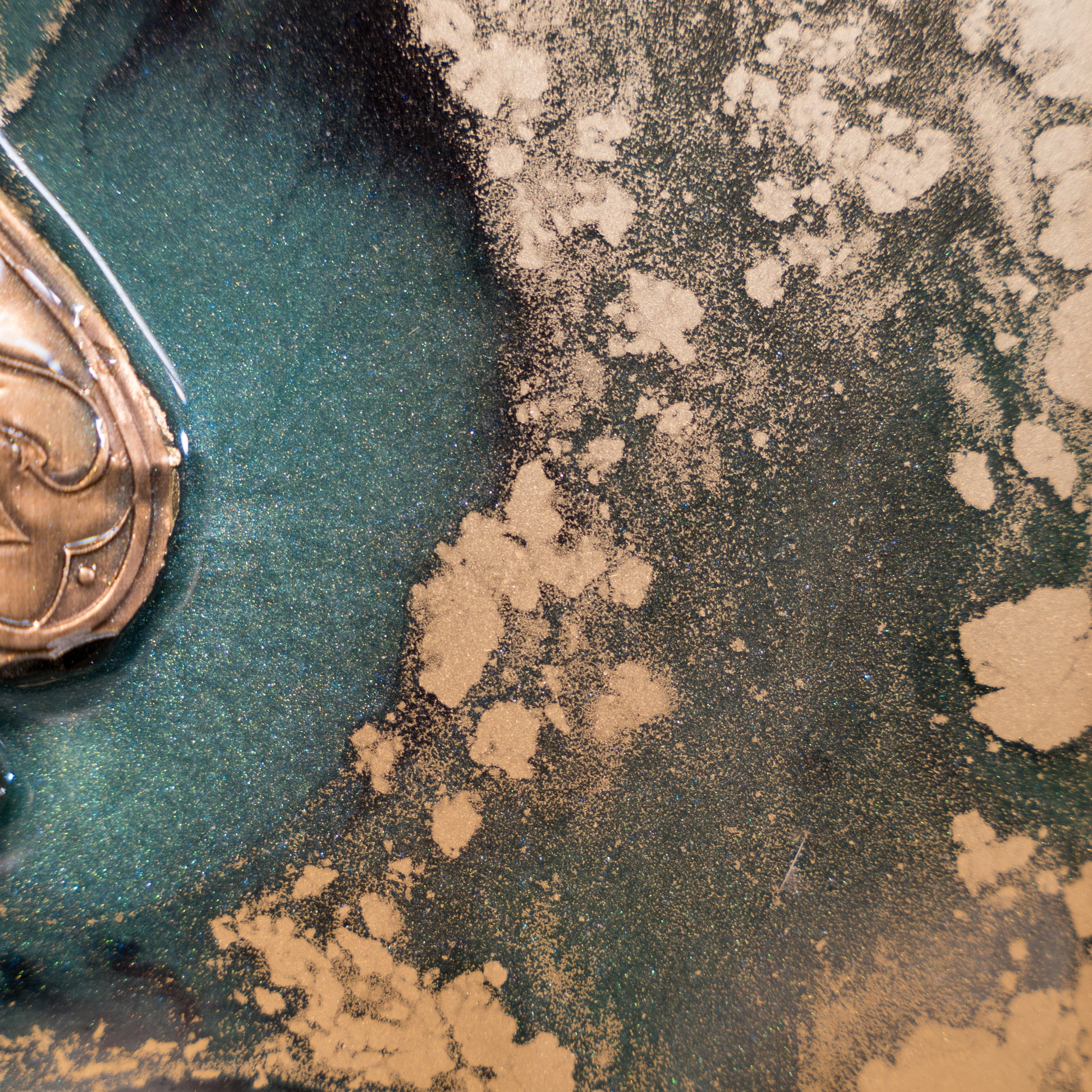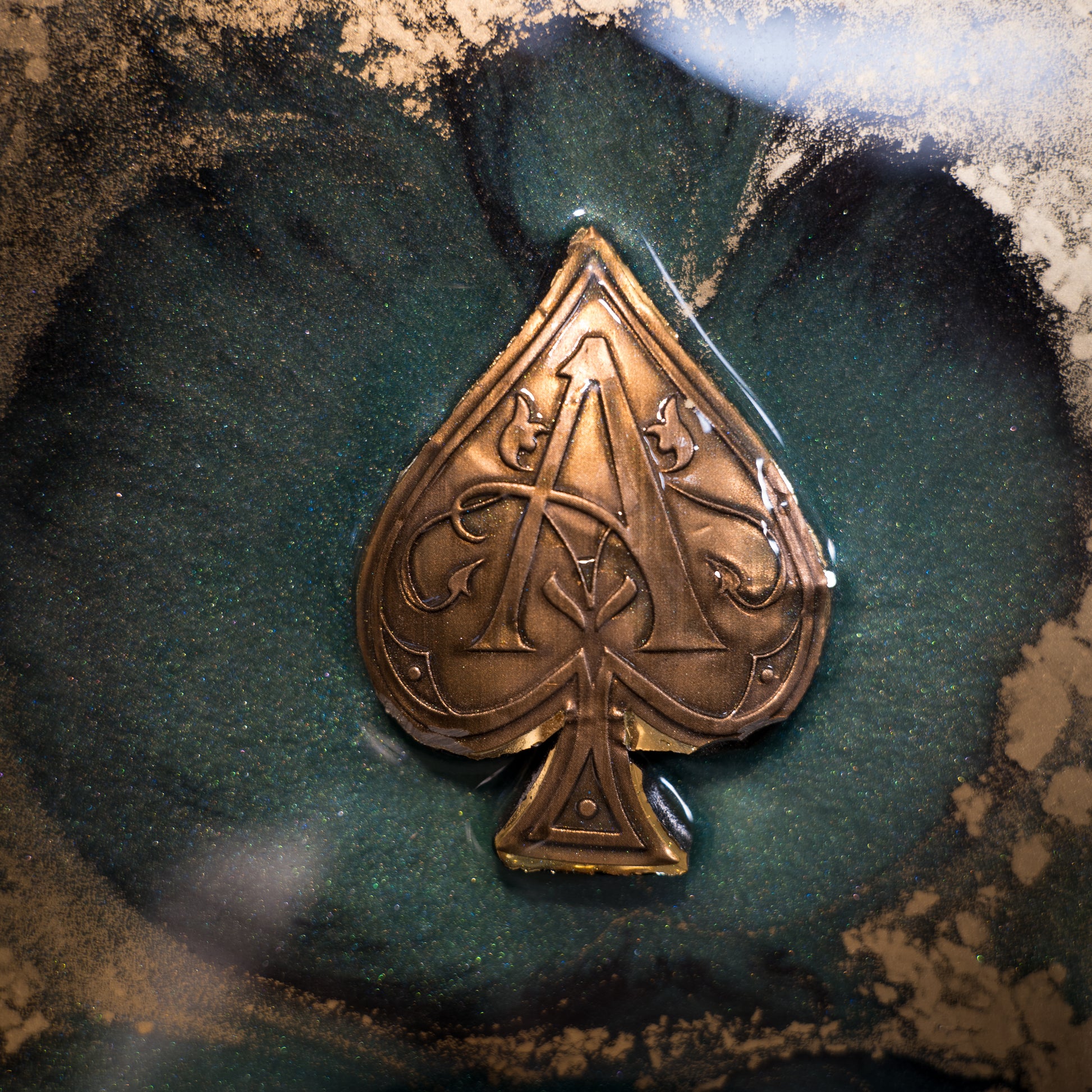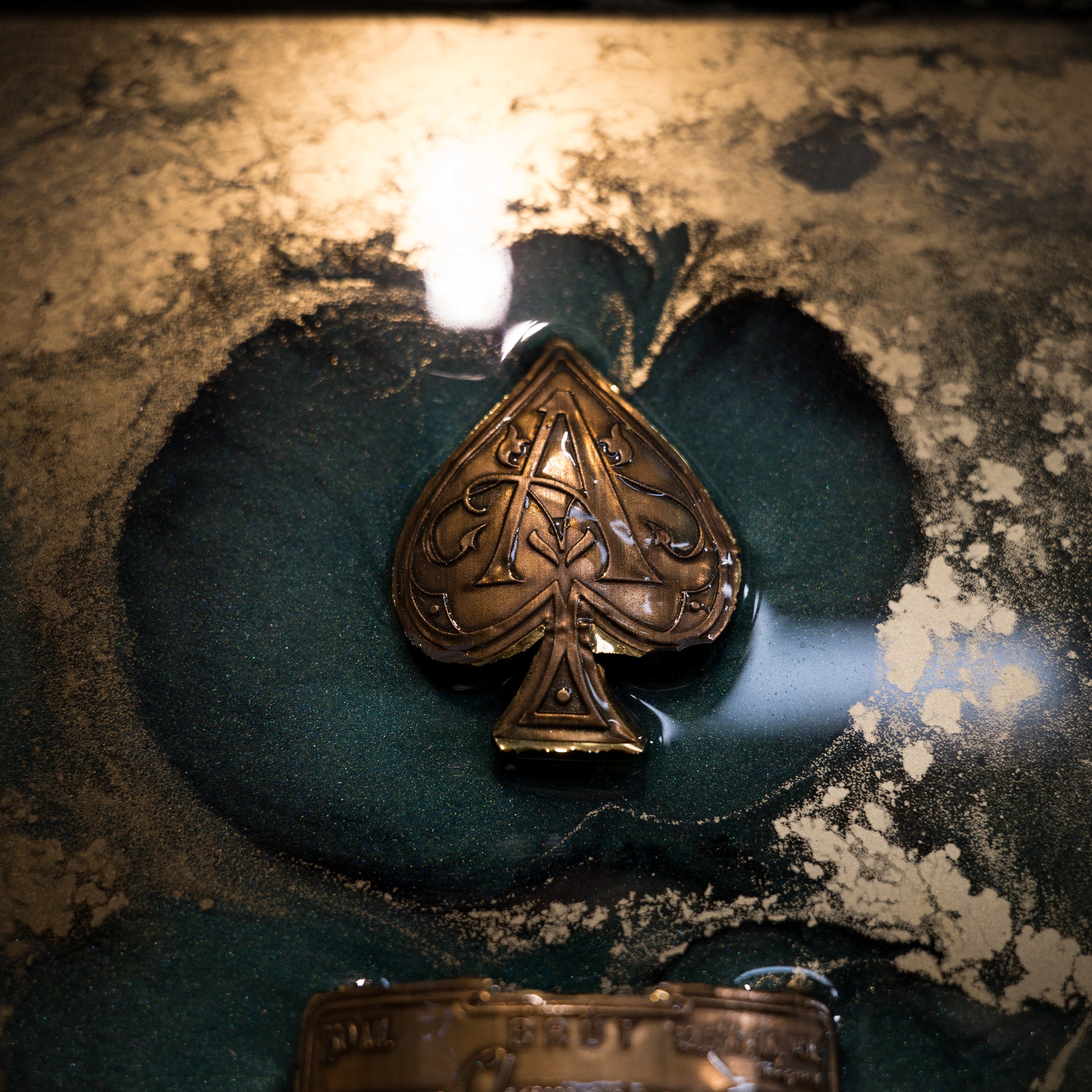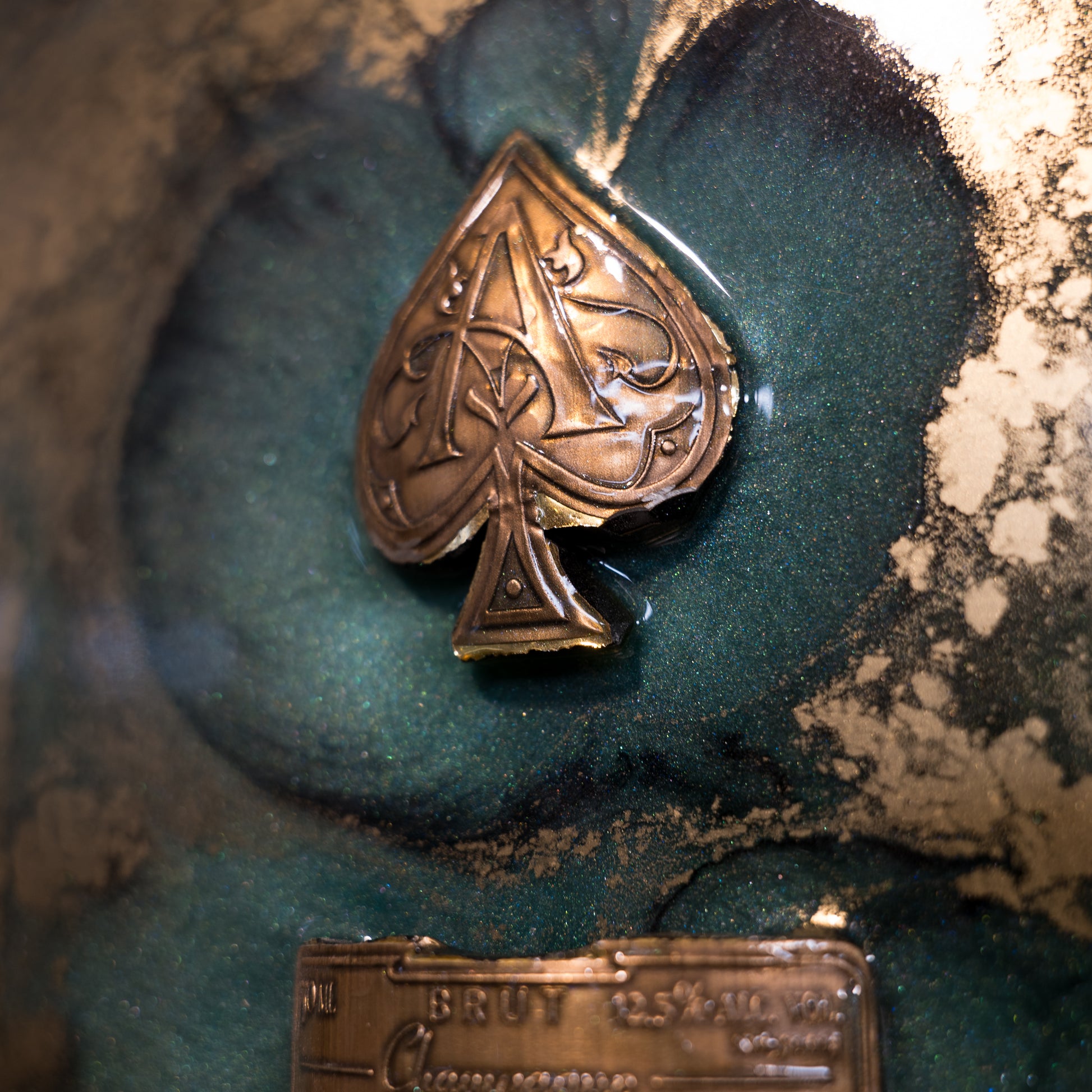 La cornice moderna lineare, dal design minimalista ma raffinato, è splendidamente accentuata dalla lussureggiante bellezza dei colori caraibici creati con resina epossidica e pigmenti unici. I frammenti di Champagne Armand de Brignac, simbolo di prestigio e raffinatezza, aggiungono un tocco di esclusività e opulenza.